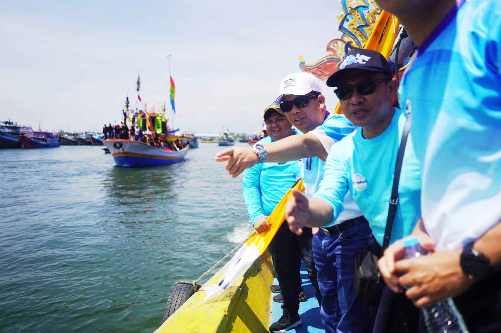 bersama rombongan dan para nelayan lalu menaiki perahu hias menuju